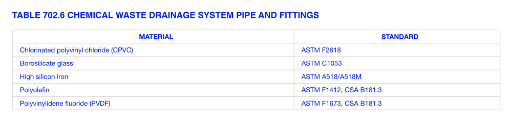 In an effort to promote clarity for plumbing professionals, a proposal was made during the 2021 code development period to introduce a table consisting of all materials manufactured to standards specifically for chemical waste drainage applications, found in projects such as hospitals, universities, and laboratories.